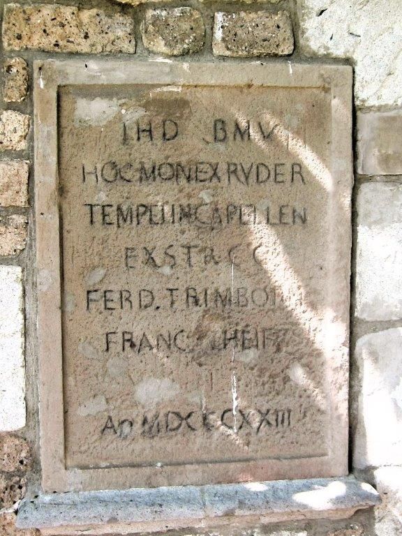 „Zur Ehre Gottes und der seligsten Jungfrau Maria haben dieses Denkmal aus den Steinen der Kirche zu Capellen die Bürger Ferdinand Trimborn und Franziska Scheiff im Jahre 1823 gebaut“.